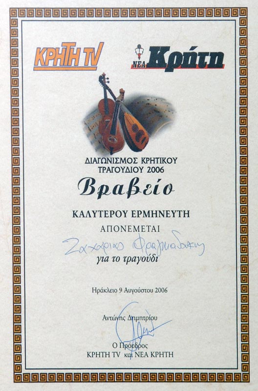 Ο Ζαχάρης Φραγκιαδάκης  γνώρισε τεράστια επιτυχία  με το τραγούδι «Ξεφάντωμα στην Κρήτη» κερδίζοντας ένα Παγκρήτιο διαγωνισμό και μπαίνοντας με αυτό το τραγούδι που είναι ύμνος στην Κρήτη..στις καρδιές όλων μας .